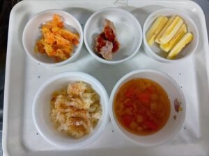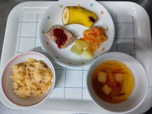 給食*バター風味おかか茶飯*豆腐ハンバーグ*紅白ナムル*焼じゃが*麩のすまし汁*バナナ