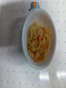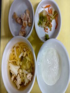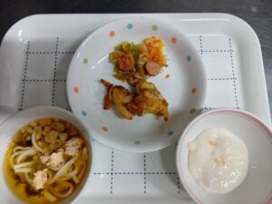 *わかめうどん*鶏肉のカレー照り焼き*野菜炒め*フルーチェ