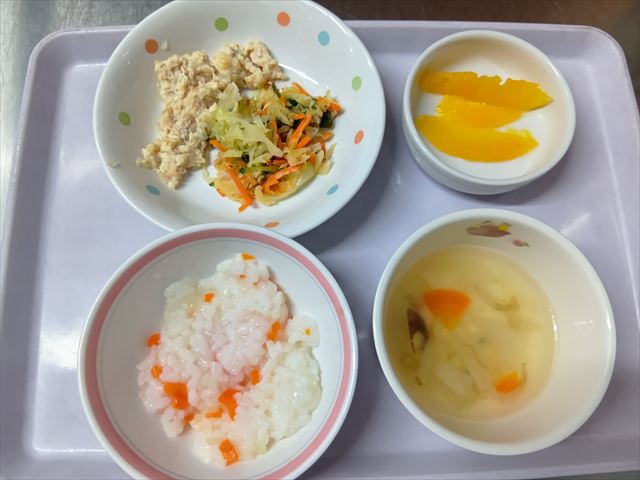 ステップ6(完了期) 野菜入り混ぜごはん 豆腐ハンバーグ キャベツサラダ きのことチキンのスープ オレンジ