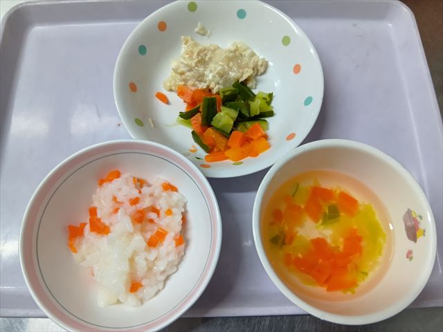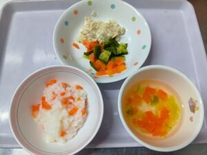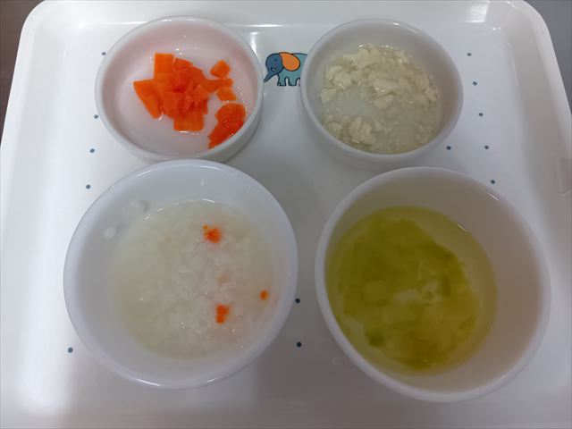 ステップ3~4中期食 野菜粥 豆腐と鶏ひきあんかけ 人参のだし煮 キャベツの汁物