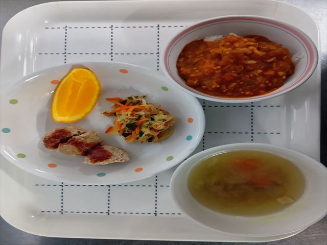 給食 みじん野菜カレー 豆腐ハンバーグ キャベツサラダ きのこと チキンのスープ 果物