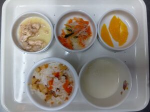 ステップ6完了期 タケノコご飯 鶏肉の塩焼き 春雨サラダ 豆乳スープ オレンジ