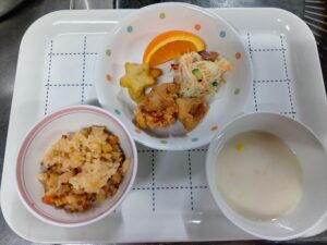 鶏のから揚げ 春雨マヨサラダ 星ポテト コーンクリームスープ