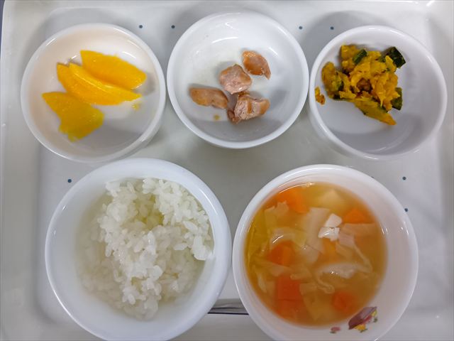 ステップ6(完了期食)軟飯チキンのアップルジンジャー焼き かぼちゃのツナサラダ豆腐とキャベツの味噌汁 果物