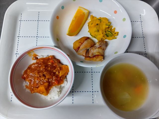 花野菜キーマカレーチキンのアップルジンジャー焼きかぼちゃサラダきゃべつの味噌汁果物