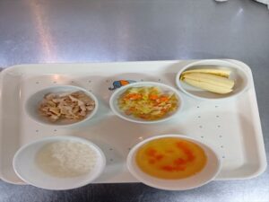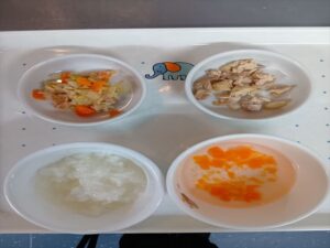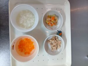 ステップ6完了期食 軟飯 鶏肉の照り焼き キャベツとツナのサラダ 人参とネギのスープ 果物