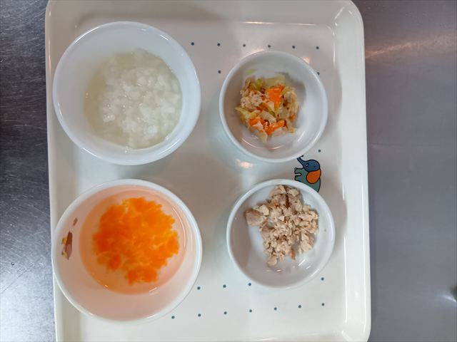 ステップ3・4中期食 お粥 鶏肉のあんかけ煮キャベツとツナの煮びたし 人参とねぎのスープ