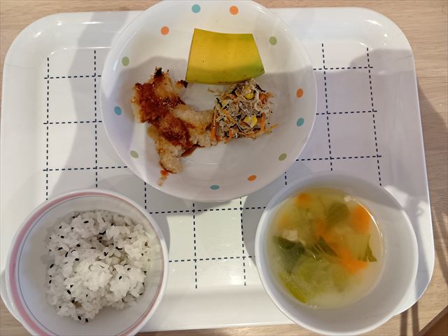 <給食>ごま塩ごはん焼きチキンカツ ひじきとキャベツのサラダ ビーフン汁 果物