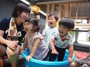 水遊びをしました。水の感触にも7月で沢山慣れてきたところで、ダイナミックに水しぶきをあげて遊ぶお子さまたちの姿がありました。保育士と一緒に水を掛け合い、とっても可愛い笑顔のお子さまたちの写真が撮れました♪