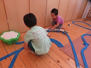 「ここに繋げようか」・・お子さまたちが試行錯誤しながらプラレールのレールをどんどん繋げていき、お部屋いっぱいに新幹線や電車のレールがいきわたりました。行き止まりになったり、スピードダウンしたり、、年齢の違うお子さまたちが会話をして、プラレールの世界を楽しんでいました。今度はどんな町が完成するのでしょうか。楽しみです!