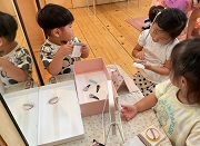 お部屋でフェルトを使った手作りのお化粧セットで遊びました。鏡を見ながら、アイシャドウを塗ったり、パフでポンポンしたり、「つぎかして!」「これやりたい!」とのりのりでお化粧をしていました。自分のお化粧が終わるとぬいぐるみにもお化粧をし楽しんでいました!