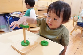 たんぽぽクラスのモンテッソーリ活動の様子です。運動会の時期は沢山、全身運動を楽しみました。自分の体をコントロールできるようになってきたお子さまたち…モンテッソーリ活動では、さらに手を使う活動を沢山用意しています。棒にリングを通したり、小さいものを掴んだり、自分で選んでやりたいだけ、活動を行い、手を沢山使うことで心の安定にもつながります。何度も繰り返し楽しむお子さまたちの姿がありました。