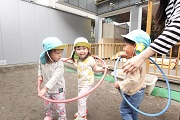 1,2歳児のお子さまは園庭で遊びました♪ フラフープと言えば電車ごっこ!お友達がやっている姿をみてやりたくなったようでみんなフラフープを持ってきて電車ごっこを楽しみました!連結が難しく離れてしまうと前のお友だちが止まってくれて皆で仲良く電車ごっこを楽しみました!