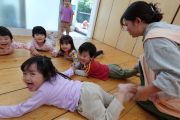 たんぽぽクラスの2歳児のお子さまの様子です。ふれあい遊びを楽しみました。みんなで手を繋いで、芋抜き遊び♪力比べをしたり、みんなで顔を合わせることが嬉しいようでした。少し簡単なルールも友達と一緒なら楽しいね♪にこにこ笑顔のお子さまたちでした。