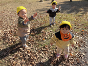 公園にお散歩に出かけると木の下に落ち葉がいっぱいでした。落ち葉の下にはどんぐりがあり見つけると目を輝かせていました。また手や足でパリパリする音や感触を楽しみ、保育士が落ち葉を集めて上に向かって落ち葉をまくとお子さまたちも落ち葉を手に持ち上にあげて撒くのを楽しんでいました。