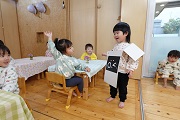 今日はたんぽぽでお店屋さんが開店しました。店員さんとお客さんに分かれ、「ラーメンください!」「おにぎりください!」と注文をし、猫型ロボットで「めしあがれ!」とお料理を届けました。にこにこ笑顔で楽しんでいて、他のクラスの先生にもお届けしました。給食でラーメンとおにぎりを出してくださり、みんな「おかわり!」と美味しそうに沢山食べていました。