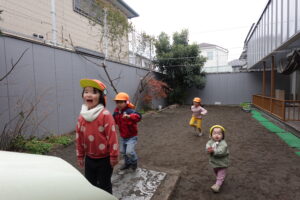 お天気は曇りぞらでしたが、お子様たちは元気いっぱい!今日も幼児クラスのお子さまから乳児クラスのお子さままで様々な年齢のお子さまが元気よく遊んでいました。幼児クラスのお子さまが、「だるまさんがころんだ」としていると、にこにこと0歳児クラスのお子さまが近づいていました、お兄さんお姉さんの楽しむ様子をじっと観察していました♪