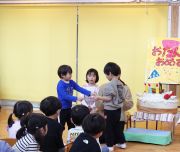 今日は2月のお誕生日会でした。お誕生日会はお子さまがとても楽しみにしている行事でした。司会のお友達がプレゼントを渡しているところです。「おたんじょうび おめでとう」と言っています。お誕生日は、お母さん、お父さんと初めて会えた日♪と以前、お子さまが言っていました。そんな素敵な誕生日会でした♪