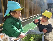 園庭にあるプランターで育てているニンジンがもう少し大きくなりそうなのでお子さまたちと間引きしました。間引きしたものにも小さいものができており、抜くと驚いたり嬉しそうな表情を見せていました。大きくなるのが楽しみですね。
