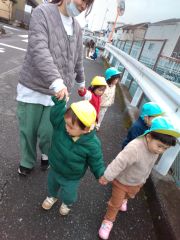 のお子さまたちで園の周りをぐるっとお散歩をしてきました。歩くときはお友達と手をつなぐのがお約束です。お写真のようにしっかりとつなげています。途中の川沿いではカモさんが泳いでいて、上からのぞいたり、後を追いかけて歩いてみたりとたのしんでいました!