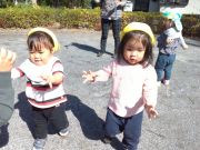 今日は晴れてお日様もあたたかく感じる中、公園へお散歩に行ってきました。広いところでシャボン玉を沢山飛ばしてみると、とっても嬉しそうにみんなで追いかけていました。手に触れると消えてしまいますが、次々に飛んでくるシャボン玉をつかまえようとする姿がとても可愛かったです。沢山のまてまて~がありましたよ!