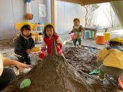 今日は園庭で砂遊び!大きい山にとんがりの型抜きをしました。型にしっかりと砂を入れて固くしたら山の上にのせます。さあ~ここからがみんなの出番です。型の周りを外から叩きます。合言葉はトントコトントントン♪合言葉を言いながら叩きはじめると、自然に集まって叩き出します。そろそろいいかな~?とそっと型を持ち上げるとジャ~ン!!大成功~!!とっても喜んでいましたよ♪