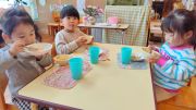 今日は土曜日なので、お子さまたちもゆったりと過ごしています。2歳児のお子さまたちは食具を使いお皿を持って上手に食べられるようになりました。好きなことをお話ししながら、楽しいお食事タイムです。